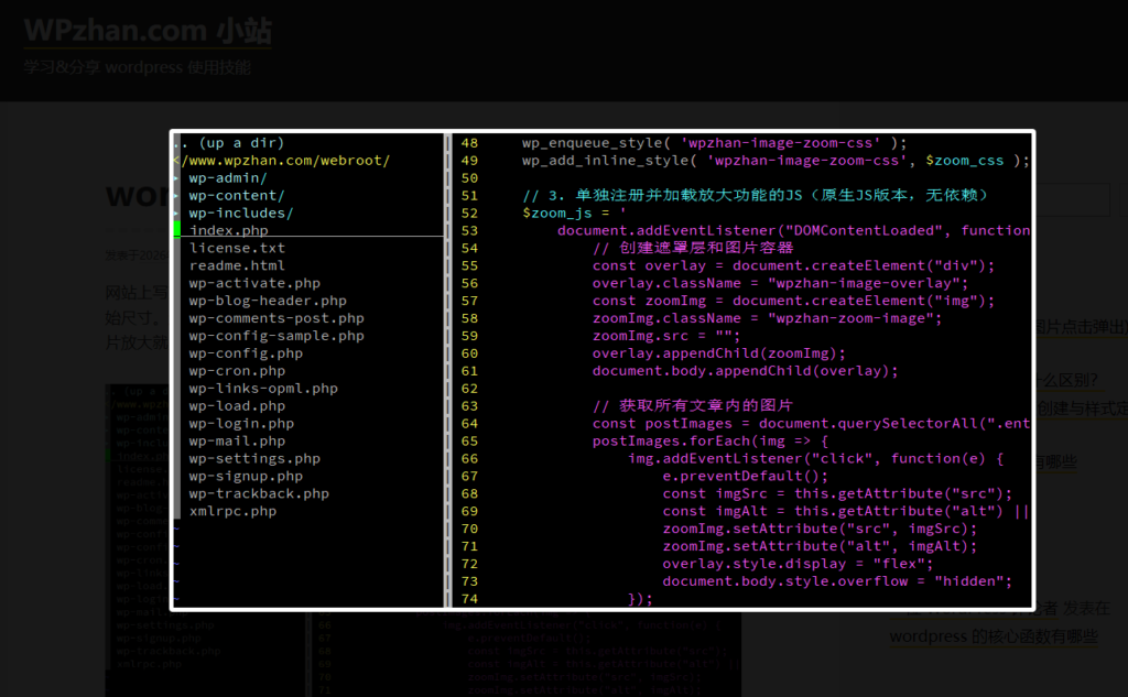 网站上写文章插入图片是很常见的操作,如果插入的图片太大,在文章区域图片可能小于原始尺寸。这样就会变得模糊看不清,如果图片上是文字,情况就会变得更糟糕。所有点击图片放大就是一个很常见的功能,这里分享一段代码实现这个功能。