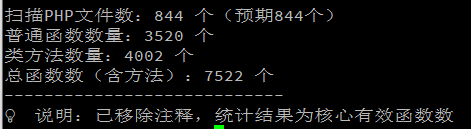 echo "扫描PHP文件数:{$stats['file_count']} 个(预期844个)\n";